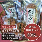 「ざらめせんべい」をはじめて購入される方は、両方の味が楽しめる「ざらめ・ごまざらめ各5枚入×各5袋の詰合せ」もおすすめです。