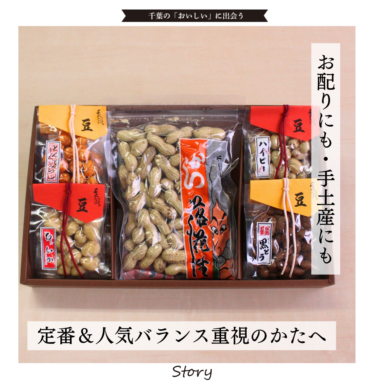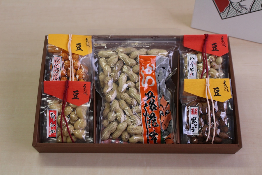 内容量:すいり落花生、バターピーナツ、ちょぼいか、ハイピー、とんとんとんがらし、あんこピーナツ、みそ落花、黒蜜きなこ、あとひき・各90g