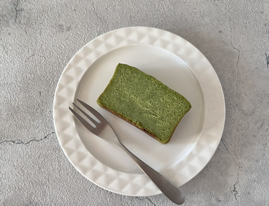 小松菜ケーキは、きび砂糖のやさしい甘さと芋焼酎のほのかな香りが隠し味。おからのしっとりとした生地に、鮮やかなグリーンが映える和風テイストです。