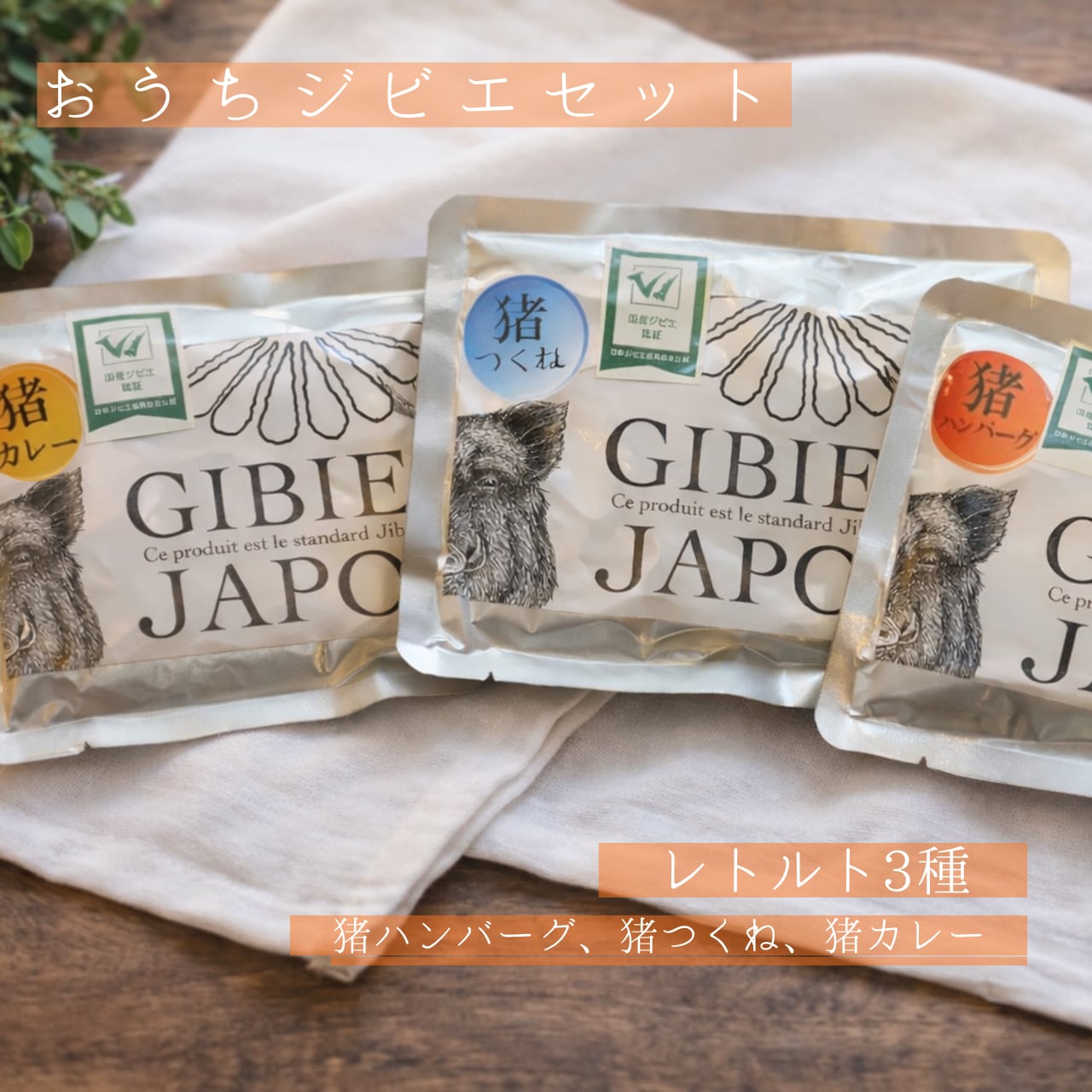 「おうちジビエ3点セット」は、ジビエ料理をもっと気軽に楽しんでもらうためのレトルトセット。