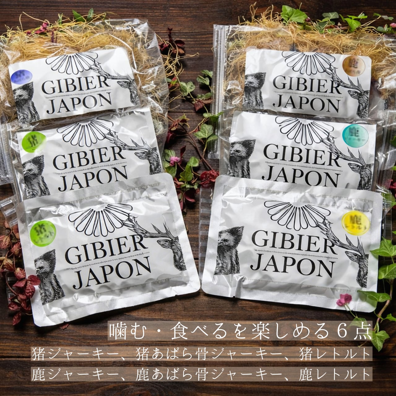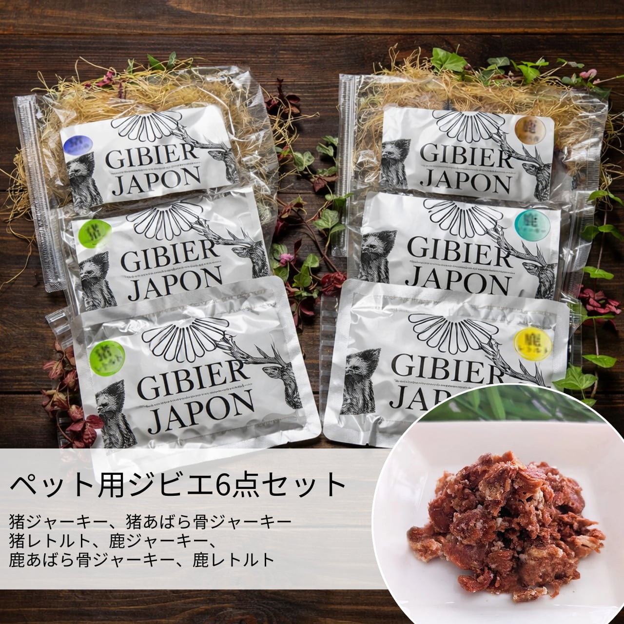 ペット用ジビエ6点セットには、猪ジャーキー、鹿ジャーキー、猪あばら骨ジャーキー、鹿あばら骨ジャーキー、猪レトルト、鹿レトルトを詰め合わせました。