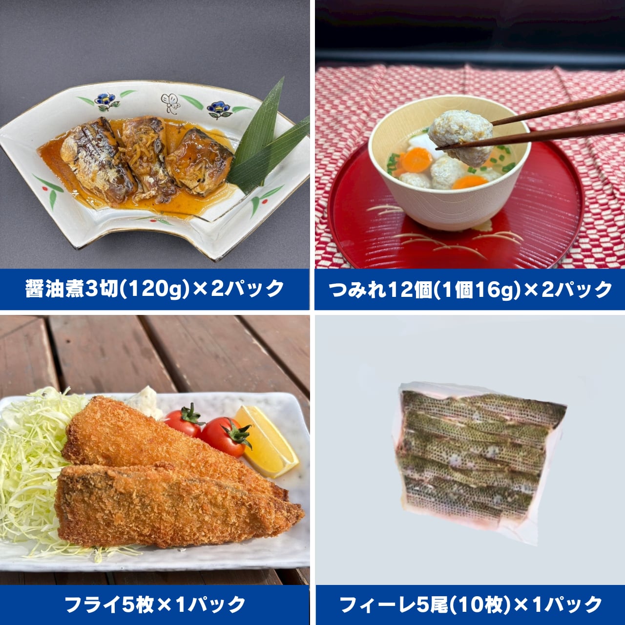 内容量:すずきフィーレ半身(400~500g)×1パック、醤油煮3切(120g)2パック、つみれ12個(1個16g)×2パック、フライ5枚×1パック、コノシロフィーレ5尾分(10枚)×1パック