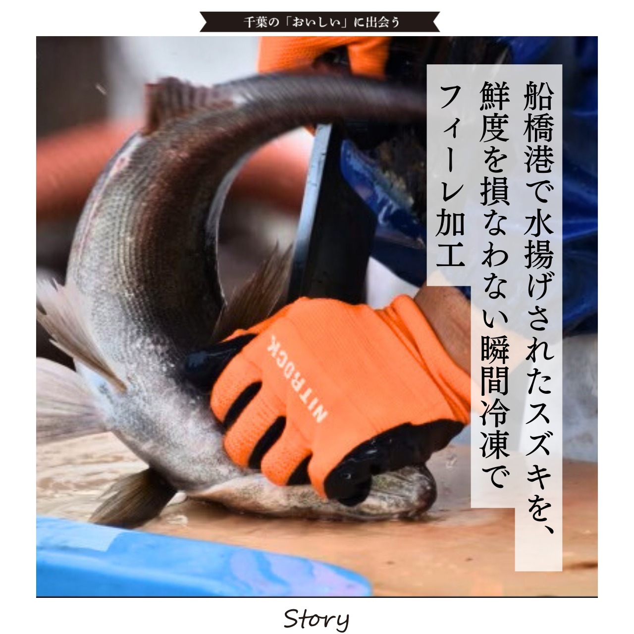 船橋港で水揚げされた新鮮なすずきを、鮮度を損なわない瞬間冷凍でフィーレ加工しました。