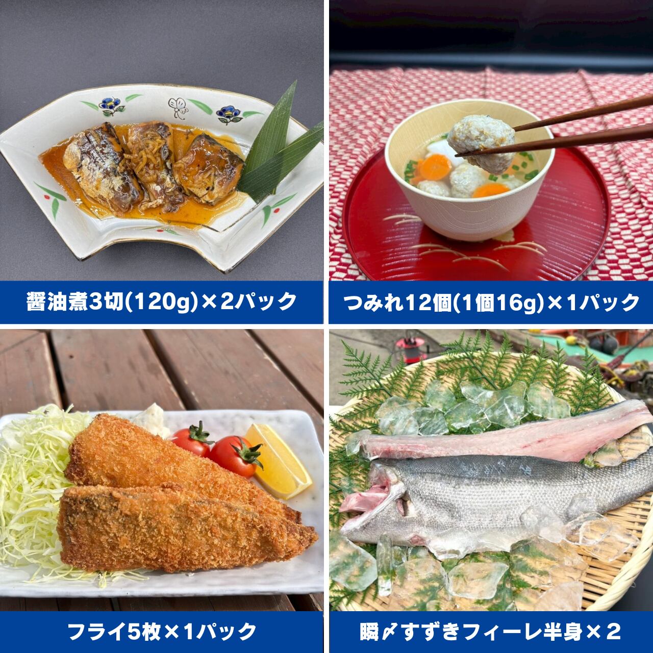 内容量:すずきフィーレ半身(400~500g)×2パック、醤油煮3切(120g)2パック、つみれ12個(1個16g)×1パック、フライ5枚×1パック