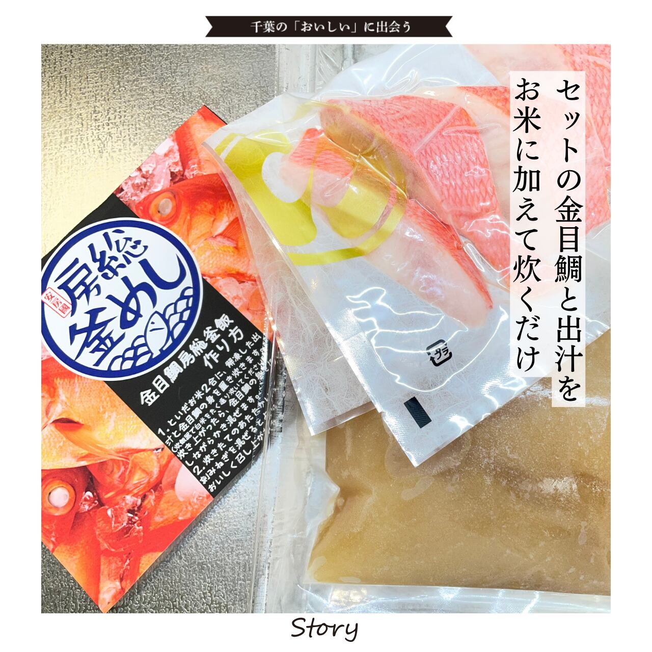洗ったお米に加えて炊くだけで、だしの旨みと金目鯛の脂がご飯一粒一粒に染み渡ります。