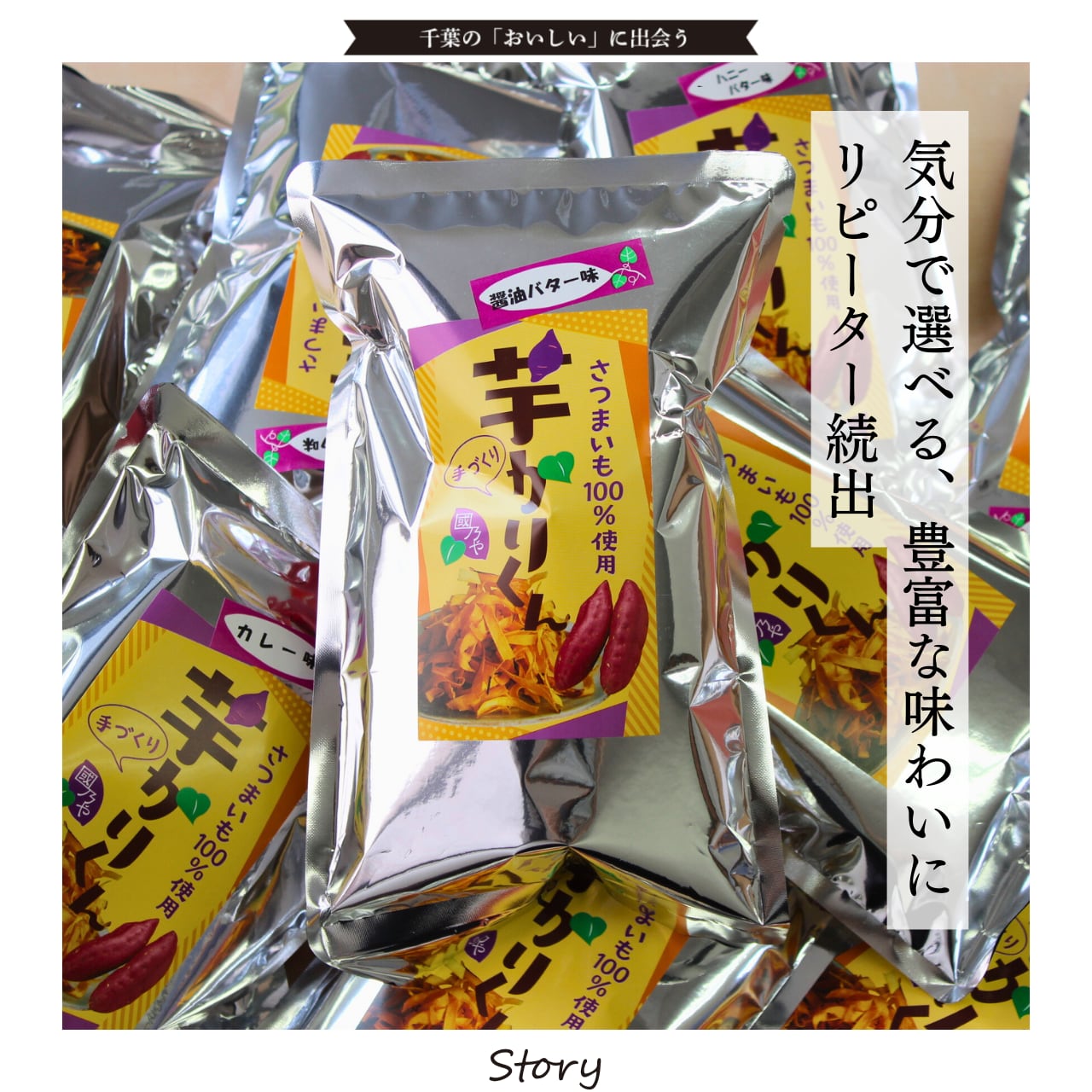 【醤油バター味】さつまいも(千葉県産・茨城県産)、植物油、食塩、砂糖、チキンパウダー、バターパウダー、魚介パウダー/調味料(アミノ酸等)、香料※一部に小麦・乳成分・さば・大豆・鶏肉を含む
