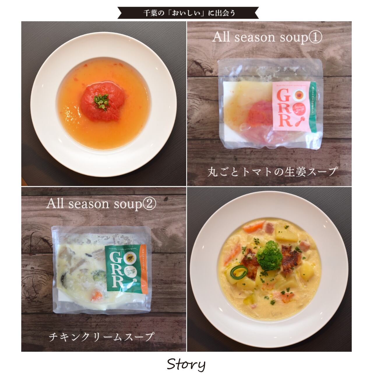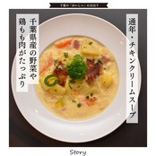 同じく通年商品の「チキンクリームスープ」は、千葉県産のじゃがいもや玉ねぎ、ブロッコリー、キノコなどの野菜に、香取市の「水郷地どり」の鶏モモ肉が入った大満足のスープです。